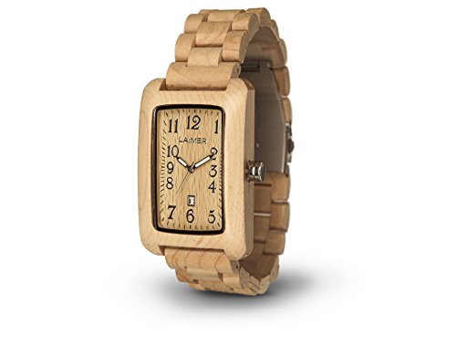 Aus hellem Ahornholz gefertigt ist diese Armbanduhr mit rechteckigem Ziffernblatt ein echter Blickfang. Die Unauffällige Datumsanzeige macht sie zwar praktisch, aber sie ist trotzdem ausdrucksvoll und sehr innovativ.